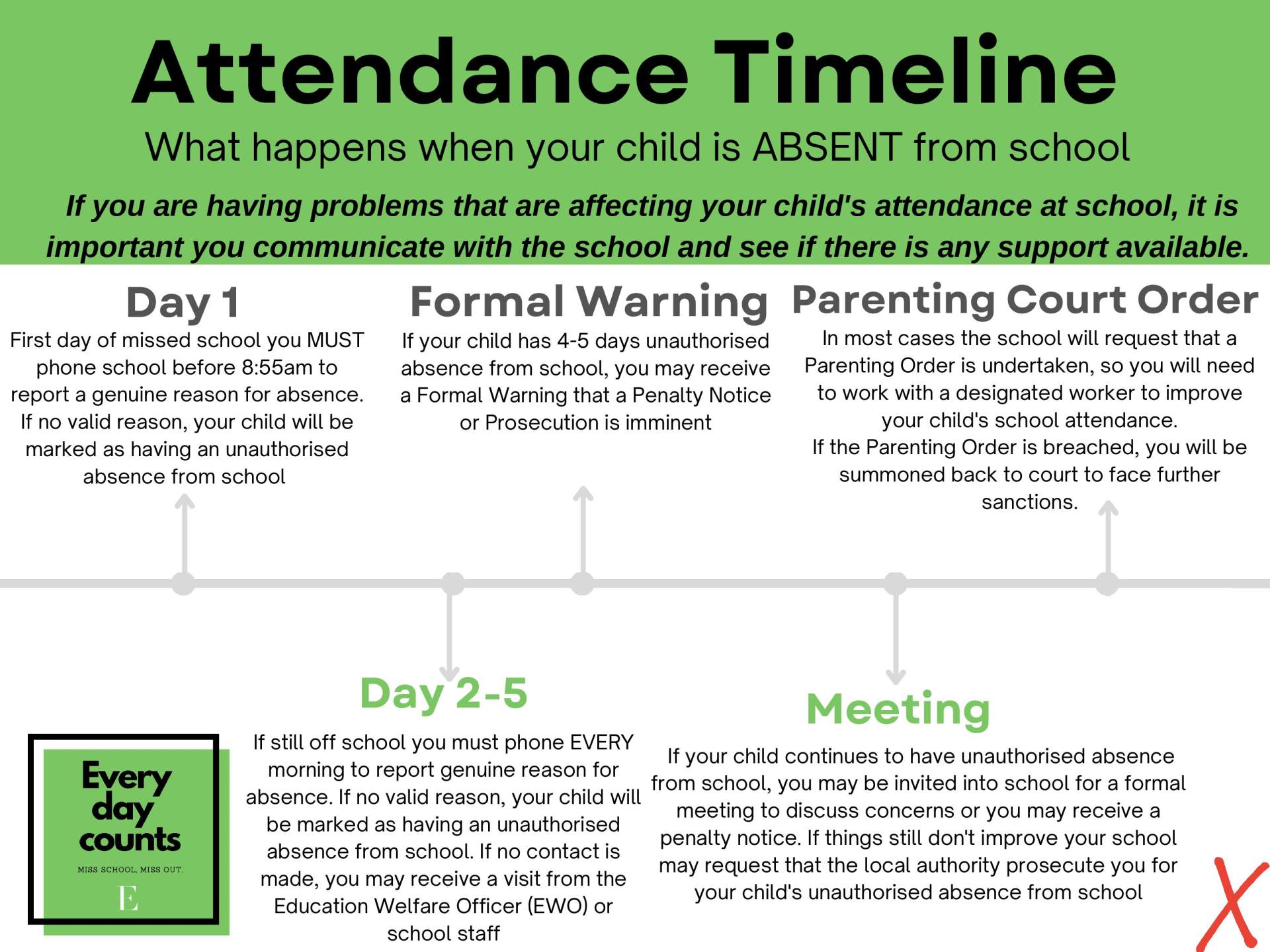 A child who misses 2 days of school a month is considered to have 'persistent absence' and will trigger the beginning of our attendance procedure and could have profound consequences for parents and carers.
