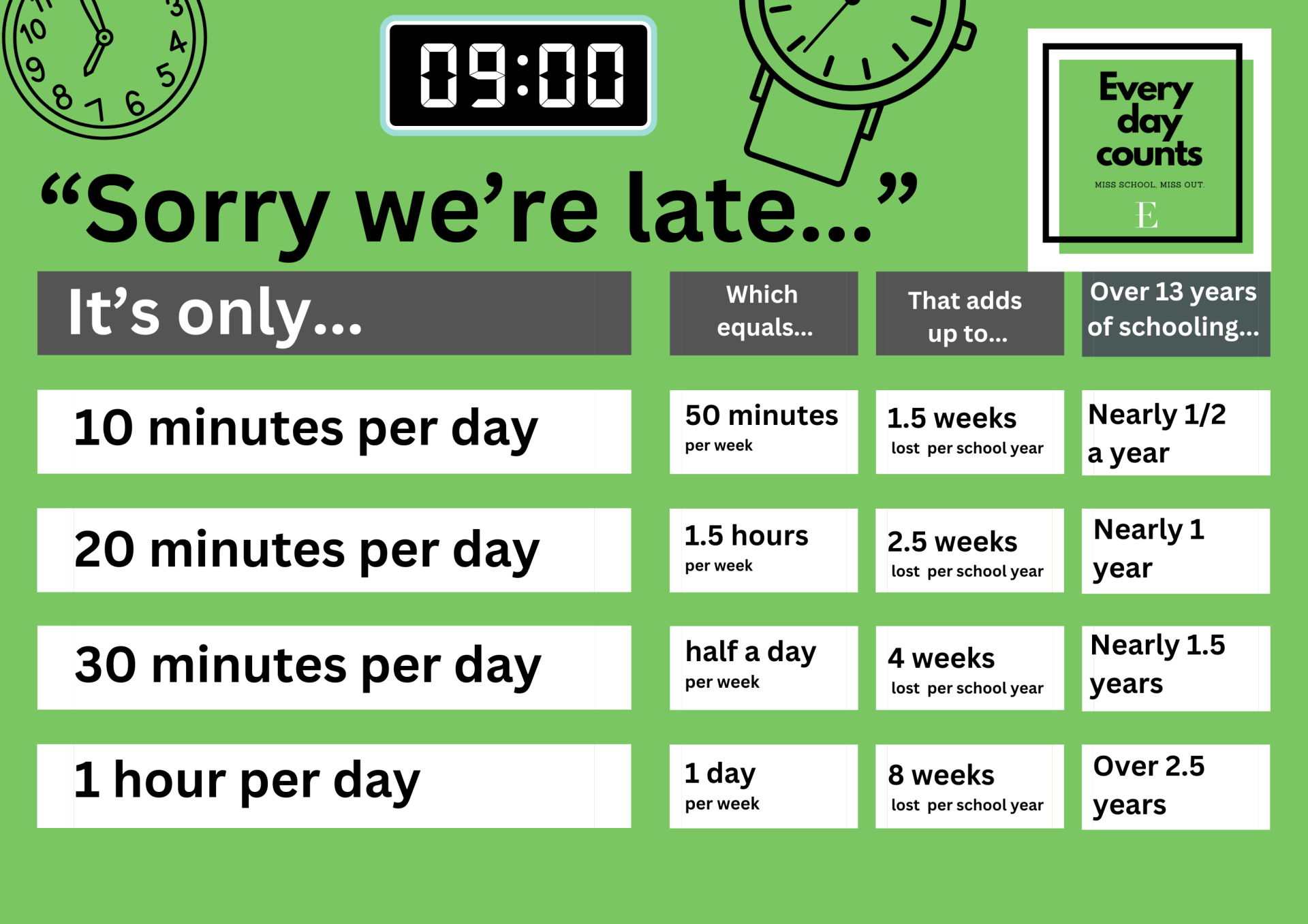 Children who are late for school miss a significant amount of learning which affects their overall achievement, academic progress and social opportunities. It is important that children do not miss the first activity of the day as this introduces and settles them into their exciting day of learning.